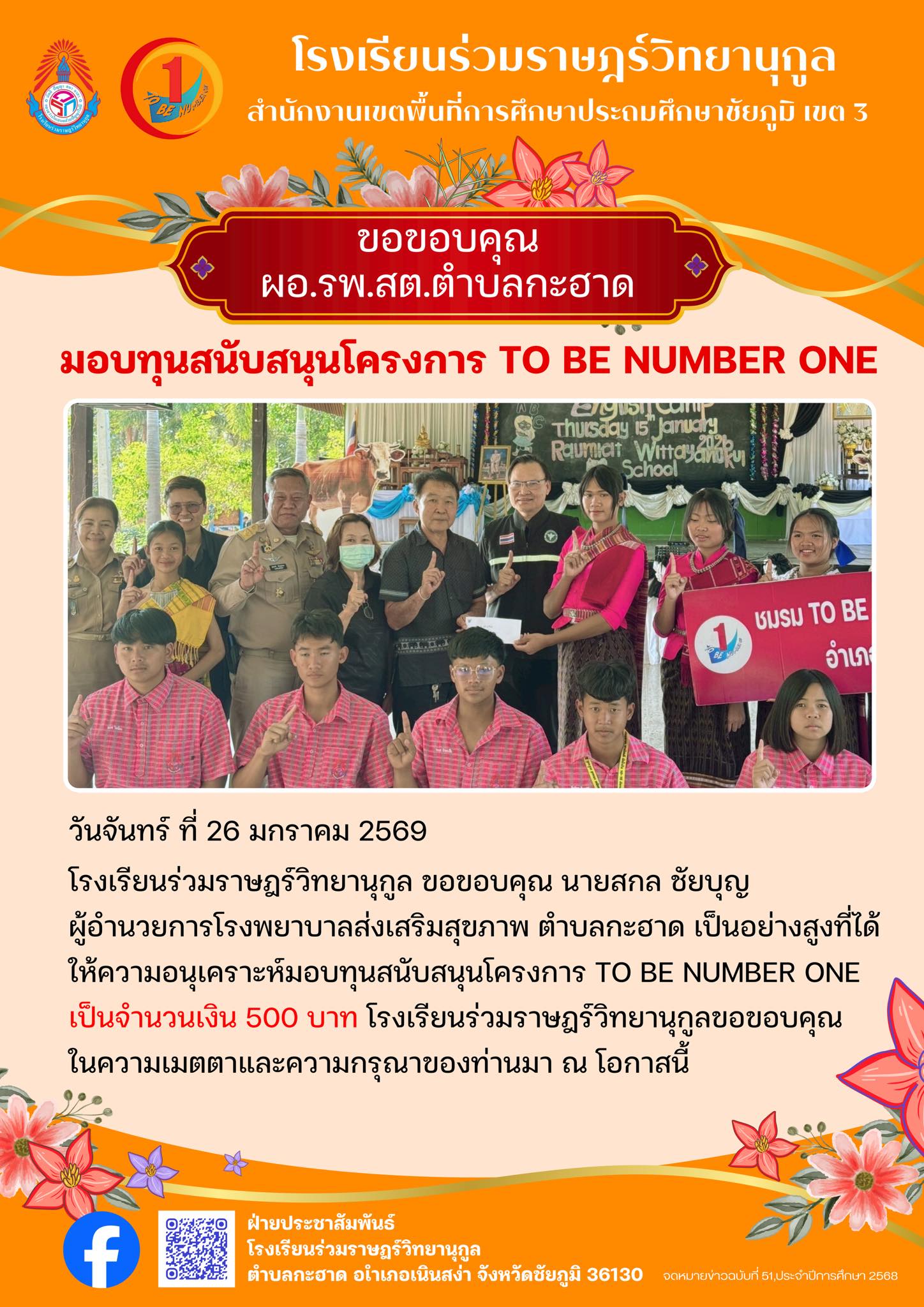 จดหมายข่าวฉบับที่ 51 ประจำปีการศึกษา 2568 เรื่อง มอบทุนสนับสนุนโครงการ TO BE NUMBER ONE จากนายสกล ชัยบุญ ผู้อำนวยการโรงพยาบาลส่งเสริมสุขภาพ ตำบลกะฮาด