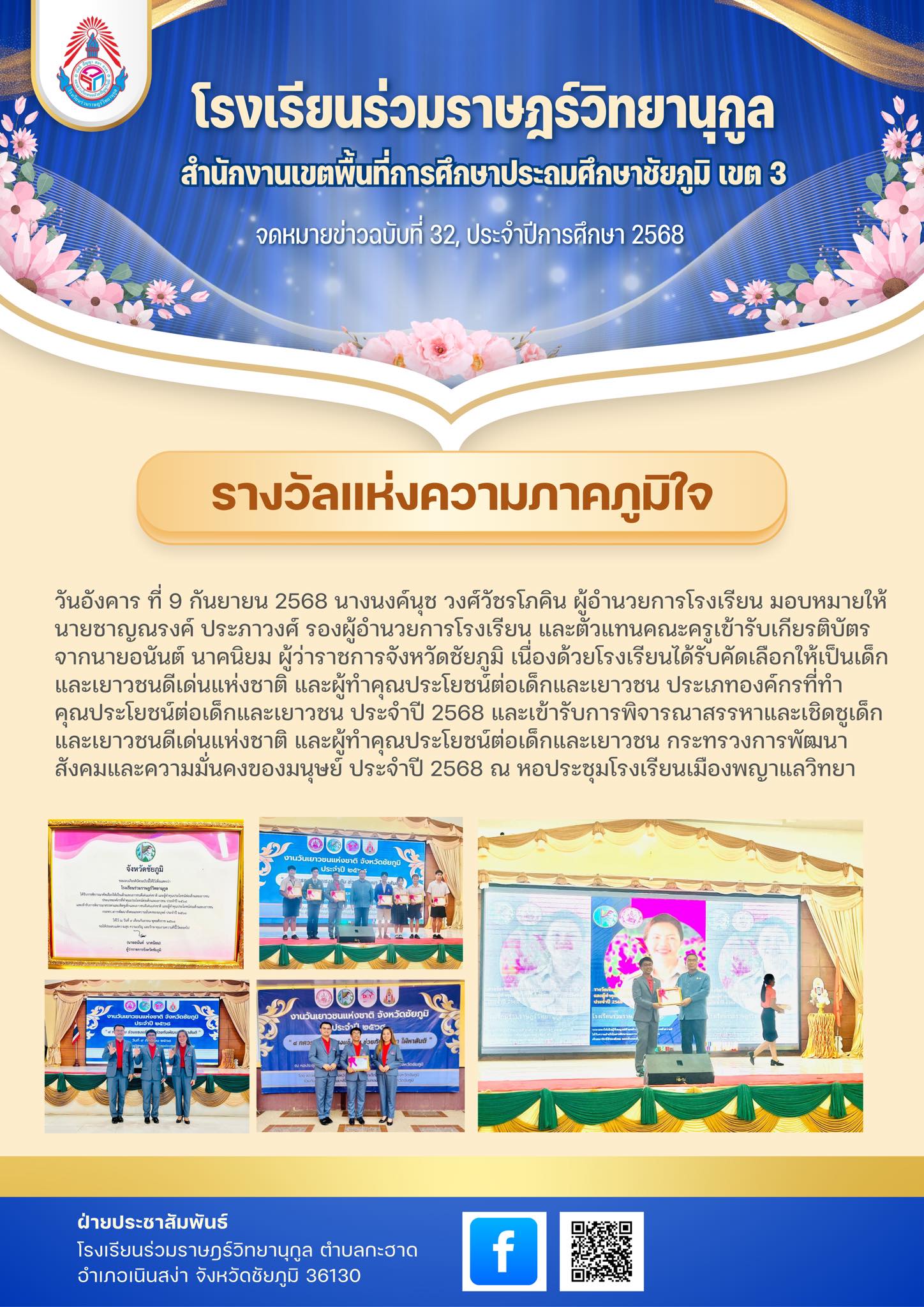 จดหมายข่าวฉบับที่ 32 ประจำปีการศึกษา 2568 เรื่อง รางวัลแห่งความภาคภูมิใจ