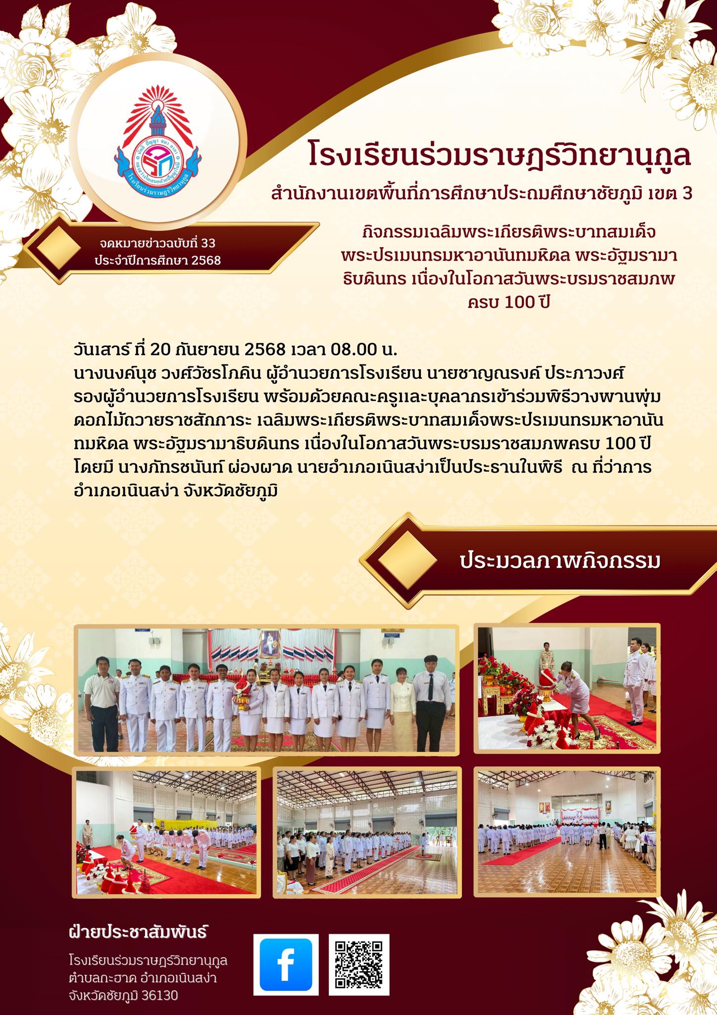 จดหมายข่าวฉบับที่ 33 ประจำปีการศึกษา 2568 เรื่อง กิจกรรมเฉลิมพระเกียรติพระบาทสมเด็จ พระปรเมนทรมหาอานันทมหิดล พระอัฐมรามา ริบดินทร เนื่องในโอกาสวันพระบรมราชสมภพ ครบ 100 ปี