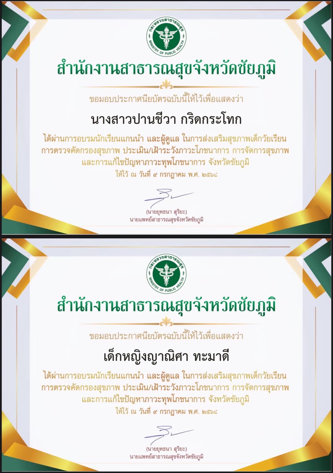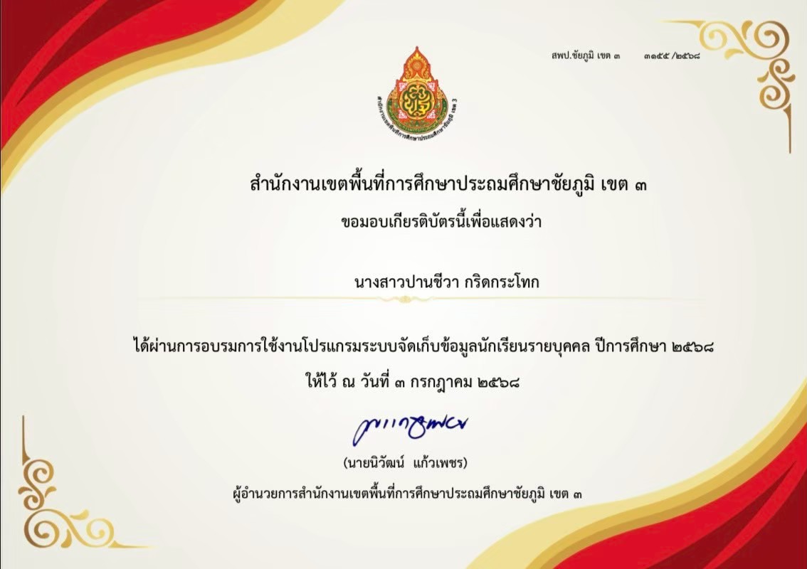 รางวัล เป็นผู้ฝึกสอน และส่งเสริมนักเรียนให้เข้าร่วมการแข่งขันมหกรรมกีฬาวิชาการเพื่อการศึกษา รายการ PHAYALAE VTEA CHAMPIONSHIP AWARDS 2024 ระดับประเทศ |